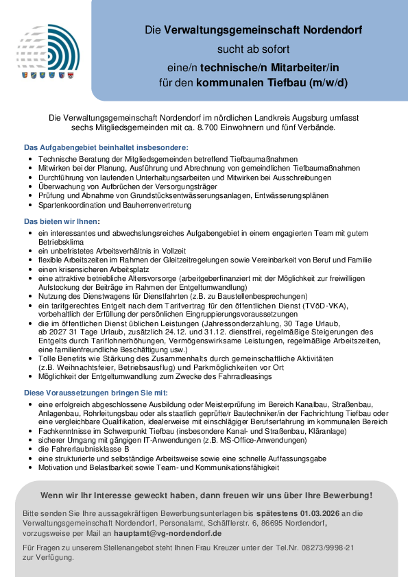 Die Verwaltungsgemeinschaft Nordendorf sucht ab sofort eine/n technische/n Mitarbeiter/in für den kommunalen Tiefbau (m/w/d)